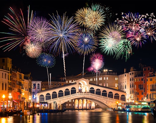 Start karnevallet i Venedig med stil den 7. februar 2026 på Markuspladsen. Festlighederne omfatter en blændende vandparade langs Grand Canal med smukt dekorerede både og optrædende, som sætter scenen for de livlige festligheder, der venter forude.
