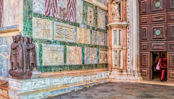 The public entrance to Doge’s Palace is through the Porta del Frumento, via the colonnade under the 14th-century waterfront façade. This floor houses public services, the Museo dell’Opera with architectural fragments and sculptures, temporary exhibition spaces in the former kitchens, and the old prisons known as the "Pozzi."